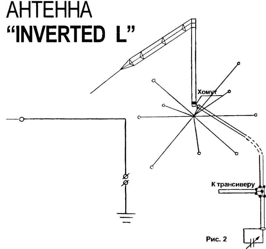 Мое внимание привлекла антенна «Inverted L», изготовленная из антенного канатика. Для повышения эффективности работы ее вертикальную часть желательно расположить как можно выше. Такая антенна принимает электромагнитные излучения как с вертикальной, так и с горизонтальной поляризацией, поэтому при работе на нее фединг, сопровождающий КВ-прием, по-видимому, должен проявляться меньше, чем при использовании классических вертикальных или горизонтальных антенн.